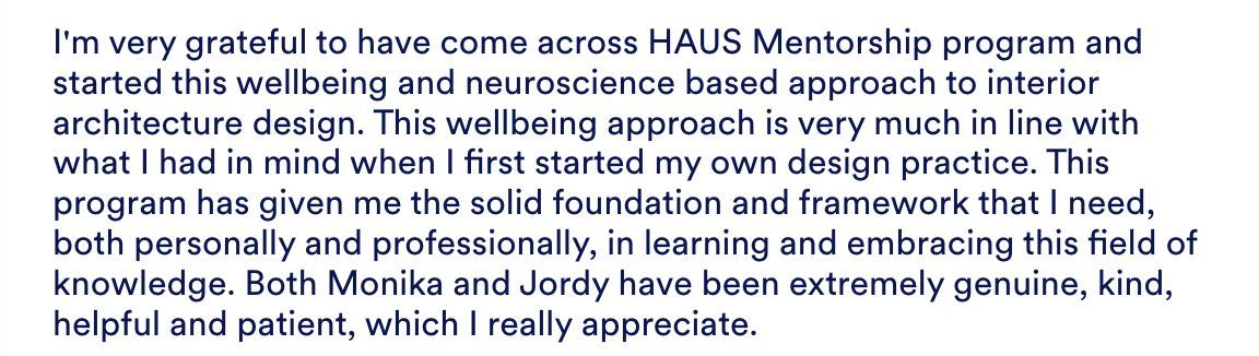 "HAUSENSE is truly a special place to be part of. The knowledge we acquire by bridging neuroscience and design is the missing part in our work as designers that want to create places that enhance well-being! It elevated my work greatly and the connections, community and the individual support you will get there is beyond expectations!"